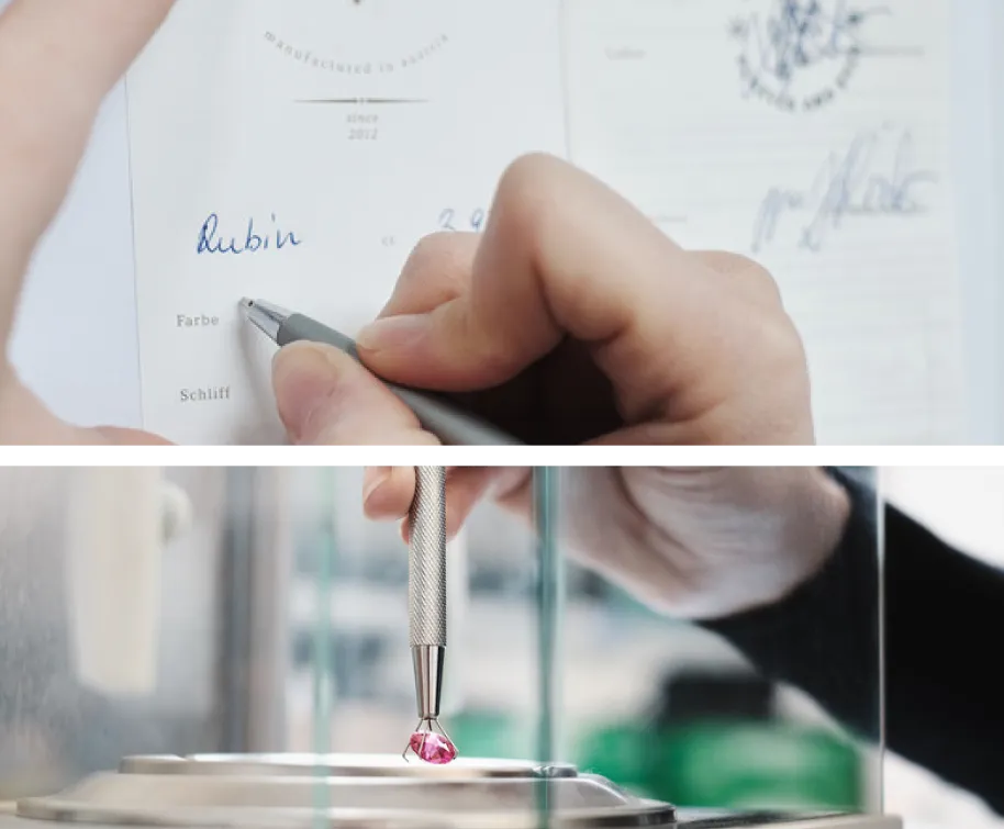 - Qualitätskontrolle des personalisierten Edelsteines, Zertifikat bestätigt die Echtheit und Vorhandensein der Elemente im Stein